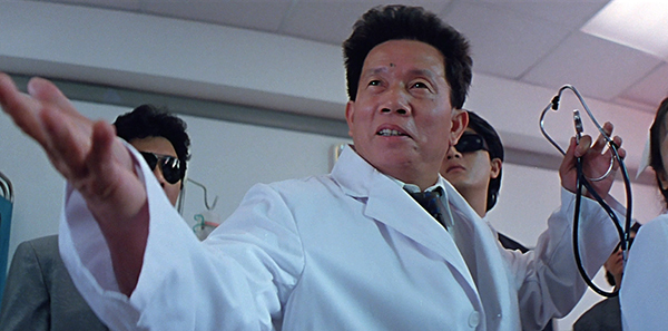 C’est sans doute l’apparition la plus mémorable de Twin Dragons. Wong Jing apparait sous les traits d’un charlatan censé guérir le corps multi-fracturé du Boss Yung suite à son accident. Intervient alors un médecin de l’hôpital incarné par l’une des figures les plus emblématiques du cinéma d’arts martiaux de Hong-Kong à savoir Liu Chia-Liang qui stoppe la séance en envoyant valser le charlatan. Wong Jing est sans doute le producteur, réalisateur et scénariste le plus prolifique du cinéma de Hong-Kong (voir du monde). Wong Jing, c’est à ce jour 186 films produits, 217 scénarii signés et 120 films réalisés ! Jackie Chan tournera d’ailleurs pour le réalisateur sur le culte Niki Larson (1993).